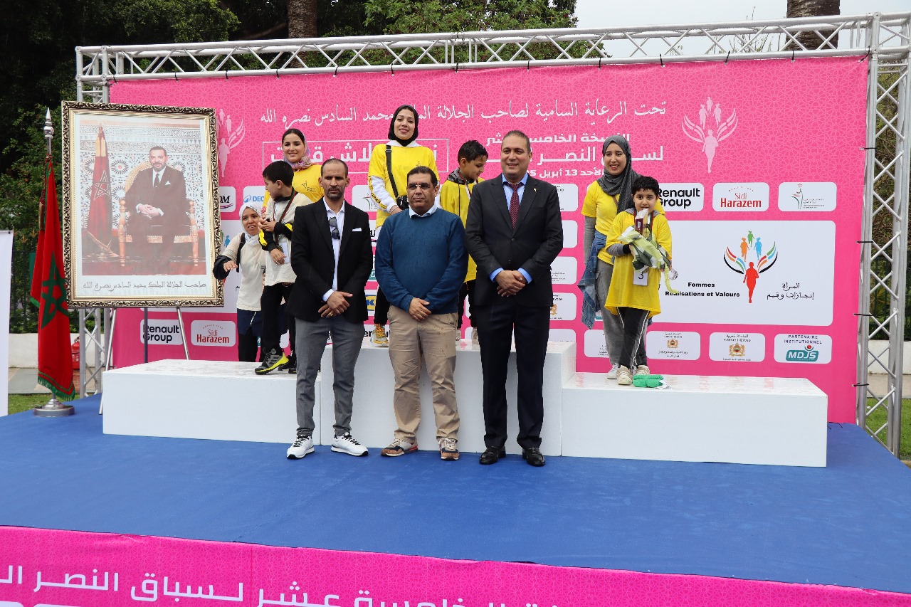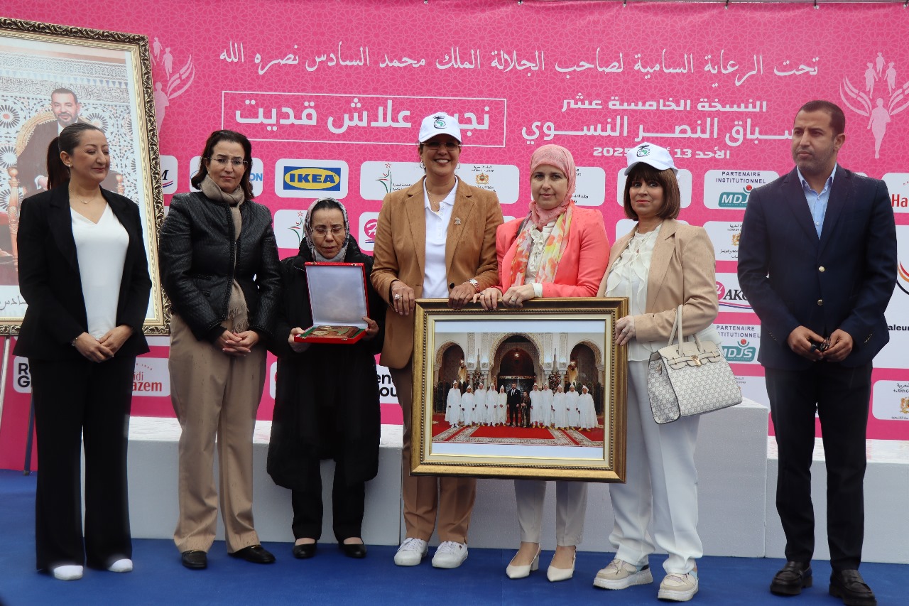 وتم في ختام هذه التظاهرة الرياضية النسائية، التي جرت في أجواء حماسية واحتفالية توزيع الميداليات والجوائز والهدايا على الفائزات، ومنها دراجة هوائية لصاحبة المركز الأول في كل فئة، وهي هدية من مؤسسة ” ديكاتلون”، من طرف كل من الشريفة للا سمية الوزارني، رئيسة الأولمبياد الخاص المغربي ووزيرة التضامن والاندماج الاجتماعي والأسرة السيدة نعيمة بن يحي وعمدة مدينة الرباط السيدة فتيحة المودني والكاتب العام بالنيابة لوزارة التربية الوطنية والتعليم الأولى والرياضة السيد الحسين قضاض،ورئيسة جمعية المرأة إنجازات وقيم السيدة نزهة بدوان والبطل الأولمبي مولاي إبراهيم بوطيب والبطلة العالمية حسناء بنحسي واللاعب الدولي السابق في كرة القدم عبد الرزاق خيري والمدير التقني المكلف بالتنمية بالكونفدرلية الإفرييقية لألعاب القوى السيد عزيز داودة ومدير الرياضة بوزارة التربية الوطنية والتعليم الأولي والرياضة ، السيد عبد الرزاق العكاري والمندوب الجهوي لقطاع الشباب السيد معاد أمان ونائب الكاتب العام للاتحاد المغربي للشرطة ورئيس اللجنة النسائية للاتحاد العربي للشرطة السيد مصطفى بودادا وأعضاء من المكتب المديري للجمعية والجامعة الملكية المغربية للرياضة للجميع وبعض شركاء الجمعية الذين تم تكريمهم بالمناسبة.