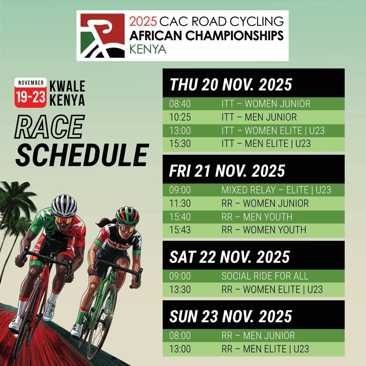 ويذكر أن النسخة الماضية كانت قد نظمت أيضا بكينيا وتحديدا بمدينة إلدوريت ( 2500 م عن علو سطح البحر) من 9 إلى 13 أكتوبر 2024 ، والتي توج الدراج المغربي عادل العرباوي خلالها بالميدالية البرونزية في سباق الفردي ضد الساعة عن فئة الكبار.