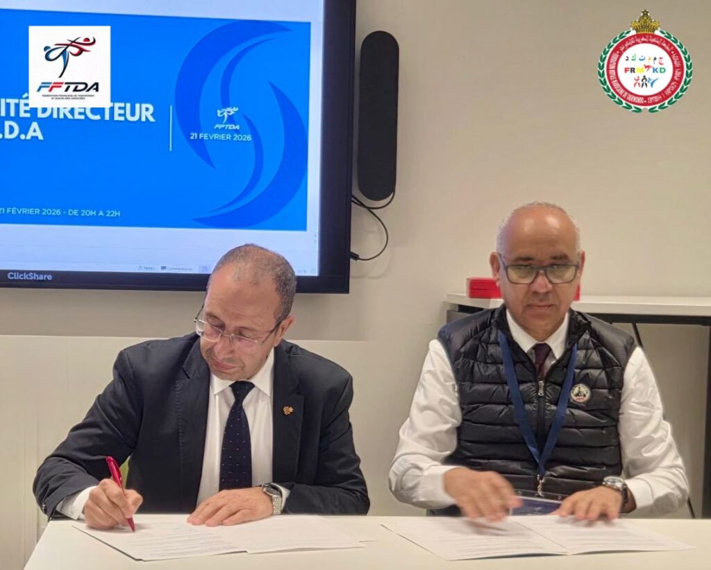 على هامش إقامة بطولة فرنسا للتايكوندو للكبار بمدينة ليون الفرنسية ، وقع كلا من السيد إدريس الهلالي رئيس الجامعة الملكية المغربية للتايكوندو والسيد حسن صادوق رئيس الاتحاد الفرنسي يوم 17 فبراير 2026 على اتفاقية شراكة ثنائية بين الجامعتين تؤكد متانة العلاقات الثنائية، وتؤسس لمرحلة جديدة من التعاون الاستراتيجي في مجال تطوير رياضة التايكوندو بالبلدين.