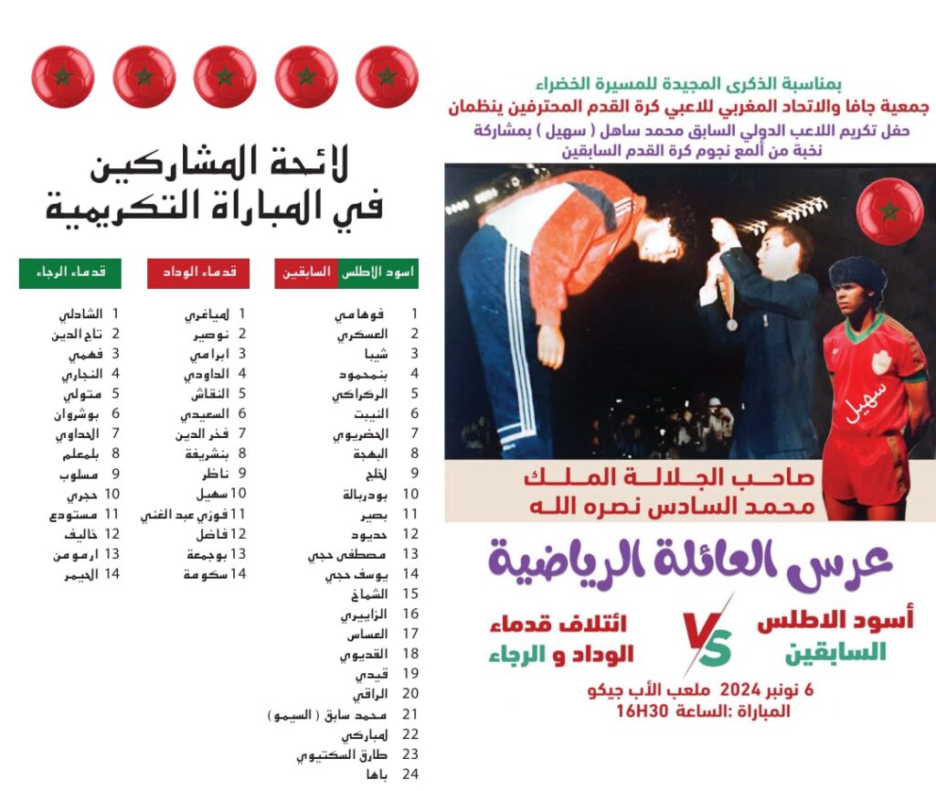 تزامنا مع احتفالات الشعب المغربي بذكرى المسيرة الخضراء المظفرة تنظم جمعية جافا للوساطة والرياضة و الاتحاد المغربي للاعبي كرة القدم المحترفين حفلا كرويا يكرم خلاله اللاعب الدولي ولاعب الوداد السابق محمد سهيل وذلك يوم 6نوبر 2024 على الساعة 4مساء بملعب الاب جيكو.وقد تقرر تنظيم ندوة صحفية يوم 28 اكتوبر الجاري على الساعة 7والنصف مساء بمطعم السقالة بالمدينة القديمة استعدادا وتقديما لهذا الحفل البهيج والدعوة عامة لجميع الصحفيين المحترمين
