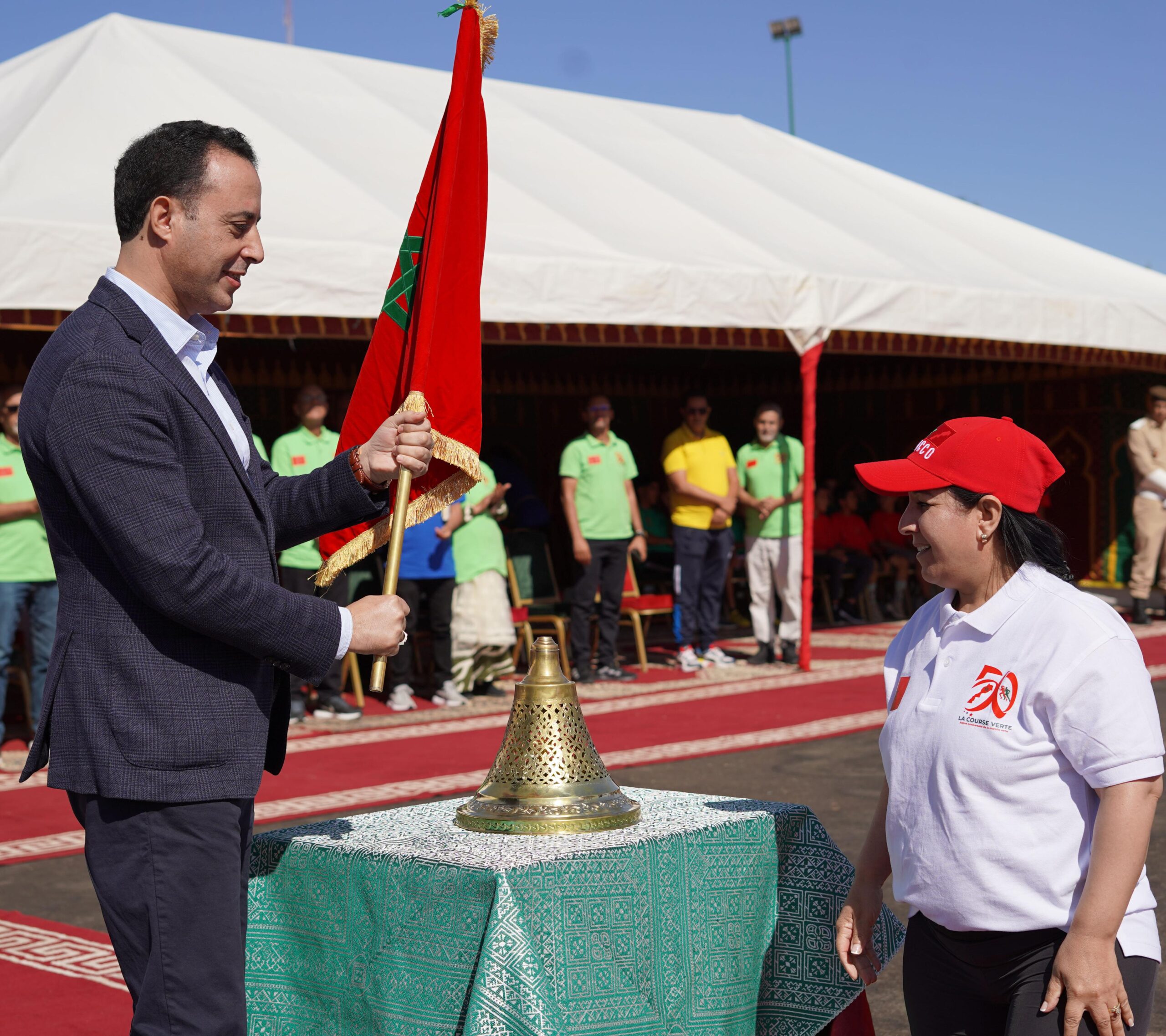 العلم الوطني من البطلة البارالمبية، ليلى الكرعة، التي حملته خلال المرحلة التاسعة التي ربطت بين تيزنيت وكلميم ، ليسلمه بدوره ، بعد عزف النشيد الوطني، لرشيد البصير ، وصيف بطل أولمبياد بر شلونة 1992 في مسافة 1500م..