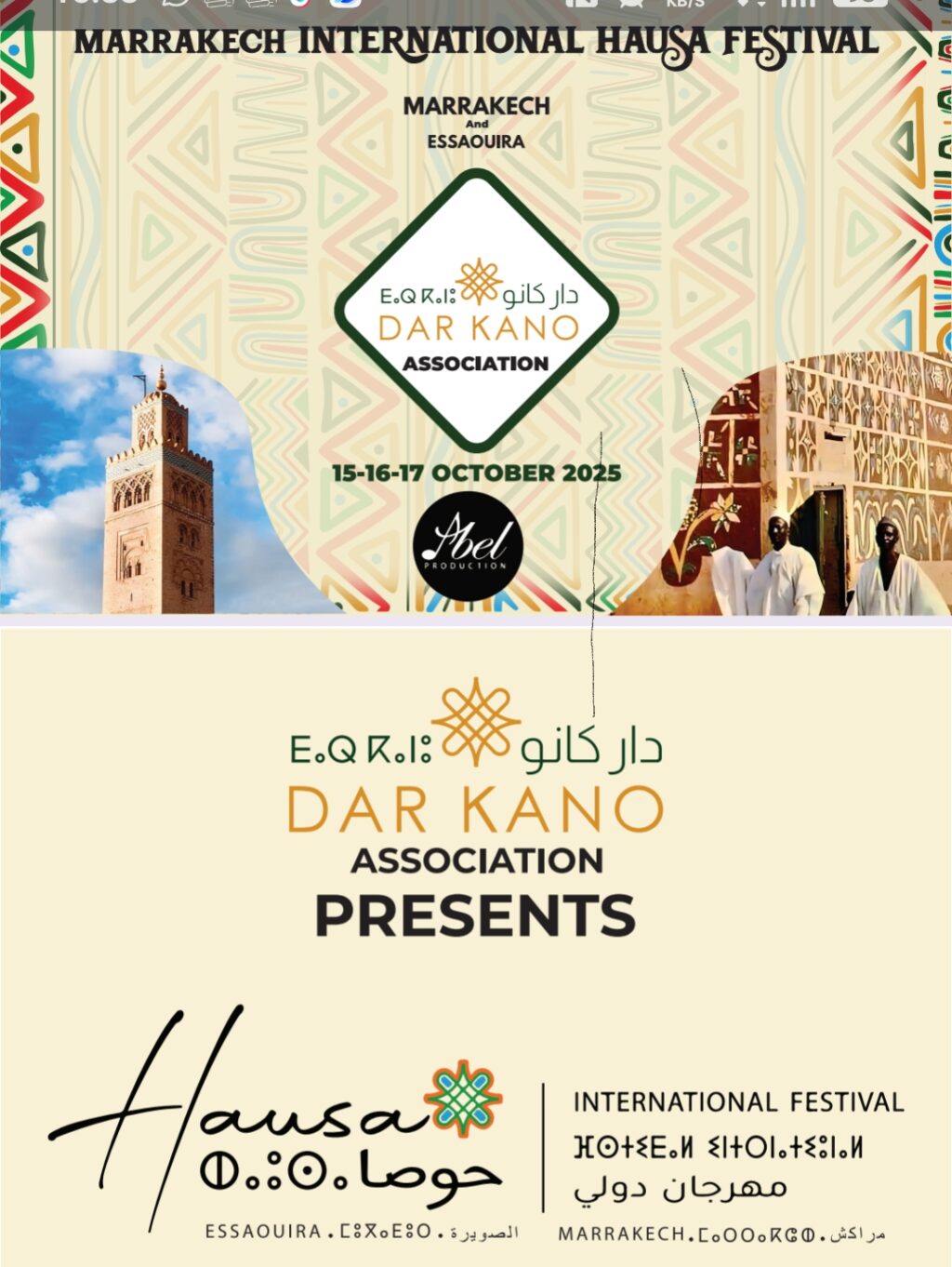 دعماًللتوجه الملكي السامي الرامي إلى تعزيز العمق اإلفريقي للمملكةالمغربية و توطيد العلاقات التاريخية والثقافية مع الدول الافريقية الشقيقة، ولا سيما إمارة كانو بجمهورية نيجيريا الفيدرالية، تعلن دار كانو للثقافة والتراث، بشراكة مع مجلس مقاطعة مراكش المدينة، عن  تنظيم النسخة الأولى من مهرجان “الحوصة” الدولي في الفترة الممتدة من15و17اكتوبر2025.على أن تسبق هذا الحدث ندوة صحفية يوم 13 اكتوبربفندق